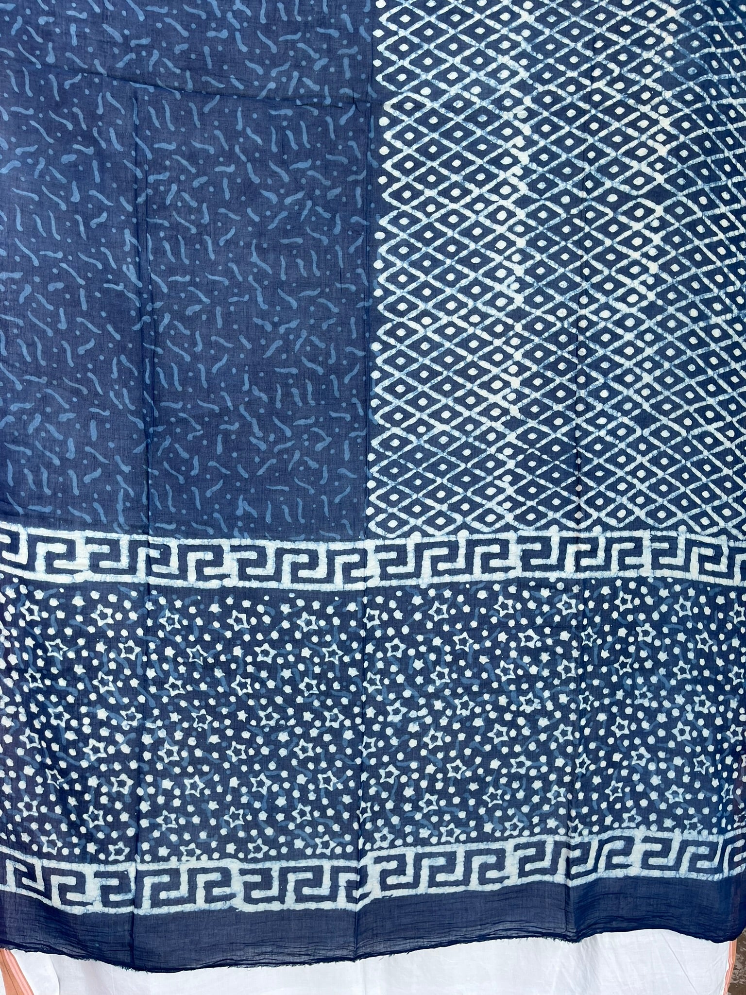 Dyed with natural and organic indigo blue dye. Border designs on both ends. Long fabric for multiple uses.