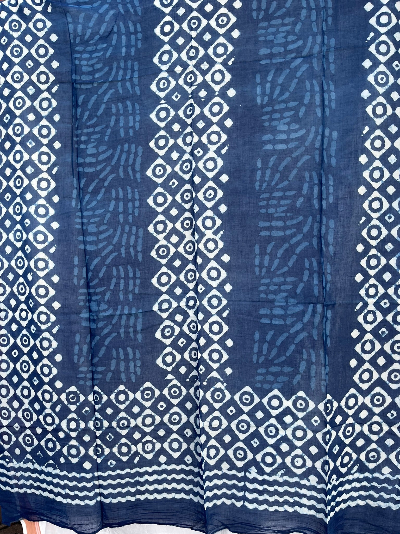 Dyed with natural and organic indigo blue dye. Border designs on both ends. Long fabric for multiple uses.