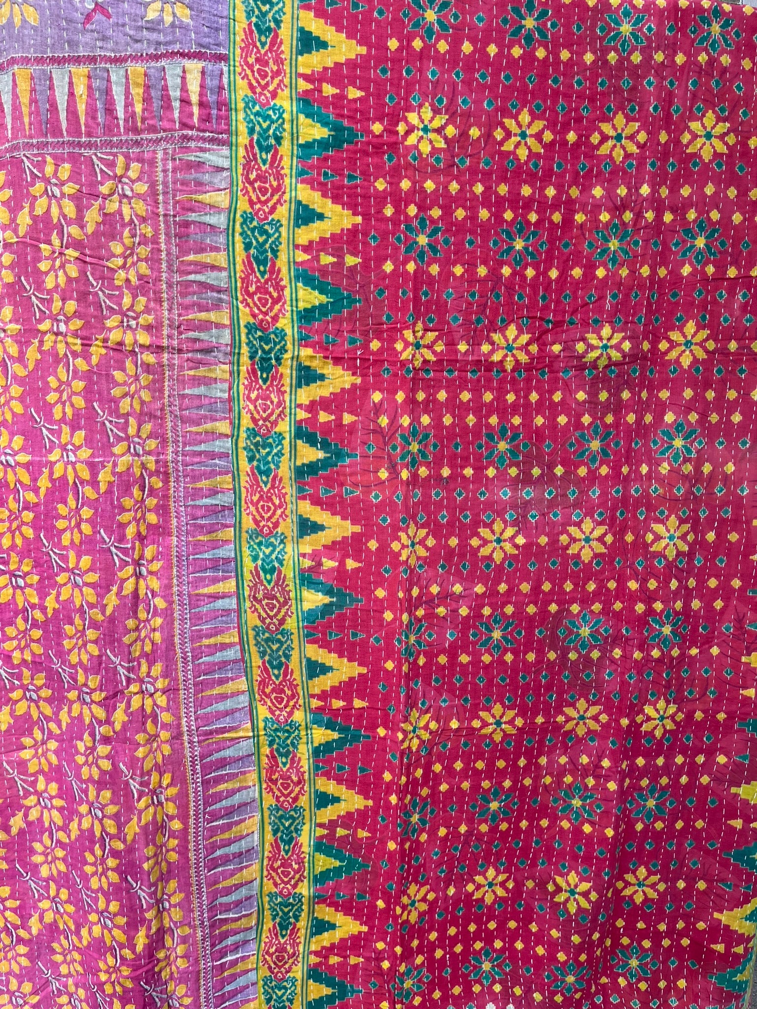 Reversible Indian quilts are made with similar or opposite color vintage fabrics. Extra texture and design with Kantha stitching. Note: Colors may be slightly lighter than they appear in pictures. May find stains or small patches on the stole that mark an artist's signature.